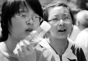 6月8日,两名考生走出考场。当日,2010年全国高考进入第二天,长春市出现35摄氏度的高温天气。