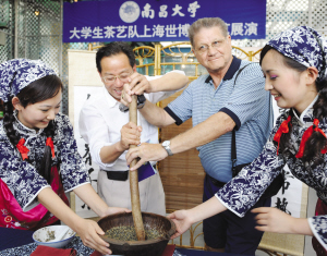 6月7日,中外游客参与“擂茶”制作。擂茶是流行于江西、福建、广东一带客家人的饮茶习俗,它将一些富有营养的食品和茶叶放在特制的擂钵中擂碎,加盐或糖,再冲入开水,调制成一种既芬芳可口、又具有驱寒祛湿疗效的饮品,因此称“擂茶”。 新华社记者 蒋林 摄