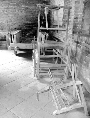 首先,要用竹子编制一个形状像簸箕一样的东西,在前面固定一块木板,打制一口长约70厘米、宽约6厘米的刀片,固定在木板上,“簸箕”上面拴根绳袢。使用时,将绳袢挂在肩膀上,一只手扶着“簸箕”紧靠身体的一端,另一只手紧抓“簸箕”的后端,然后沿麦垄方向用力向前推动,割掉的麦穗就被尽数收在“簸箕”里了。