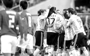 本报综合消息 北京时间昨晚,世界杯B组第2轮首战在约翰内斯堡足球城球场展开较量,阿根廷4比1击败韩国。上半时,梅西任意球造成朴周永自摆乌龙;第33分钟,梅西策动进攻,伊瓜因头球扩大比分;上半时比赛即将结束时,李青龙抓住德米凯利斯的失误为韩国队扳回一分。下半时,廉基勋错失为韩国队扳平比分的绝佳机会;此后梅西射中门柱,伊瓜因补射得手;第80分钟,替补上场的阿圭罗帮助伊瓜因完成帽子戏法。