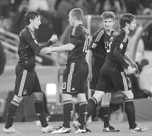 本报综合消息 赢球的,振臂欢呼。输球的,挥手庆祝。昨天的足球城球场,“德国战车”俨然变成一辆“吉普车”,德国人和加纳人双双入座,携手晋级十六强。从死敌变成哥俩好,只需要90分钟。
