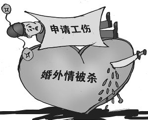 云南罗平县交通局副局长张敢在办公室被人砍死,行凶男子是罗平县钟山乡一中的一名老师。知情者说,一段“婚外情”导致血案发生。张敢的妻子认为:“老公是在上班期间被砍死,应当属于因公死亡。”要求罗平县交通局为其申请工伤。(《生活新报》7月1日)苗芹/漫画