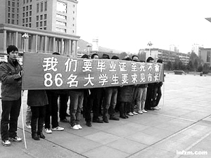 在同一学校,与刘波命运相似的至少有86人。由于维权无果,倾尽家财的刘波父亲已抑郁而死。上访受辱的广东籍学生邓宇伟和河南籍学生王洋曾在今年2月3日跳楼自杀,幸而被救。