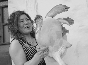 6月30日下午,徐州市民刘女士展示刚捕获的野生甲鱼。当日,江苏徐州市民刘女士的父亲在微山湖里捕到一只重7.5公斤的野生雌甲鱼。这只甲鱼裙边最宽处约10厘米,估计年龄在40岁以上。新华社发