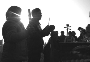 在村当中水塘北边的开阔地,或坐或站,已经围了不少人。唱大鼓的人坐在人群中央,面前摆着由几根细竹竿支起的大鼓。