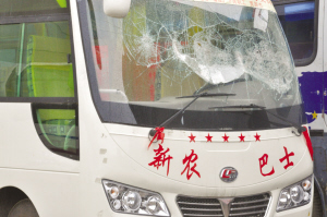 当日,记者见到了贾先生被砸的客车,只见该车前挡风玻璃已被砸坏(如图),后挡风玻璃也被砸了个大洞,无奈之下,贾先生罩上几张塑料纸充当车玻璃。“可惜啊,要把这些损坏的东西修好估计得花好几千块……”贾先生心痛地说。