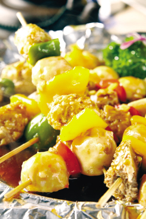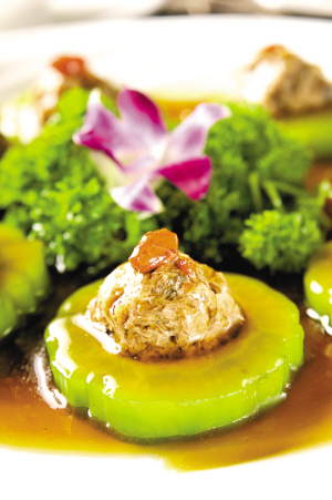 简单的果蔬经过大厨的巧思,马上变成诱人的素菜,还有现在潮流兴起的象形素菜,从鲍参翅肚到各式肉类都做得几可乱真。这些象形素菜从台湾空运过来,大多是用大豆蛋白、香菇、魔芋等做成,对人体的健康也相当有益。
