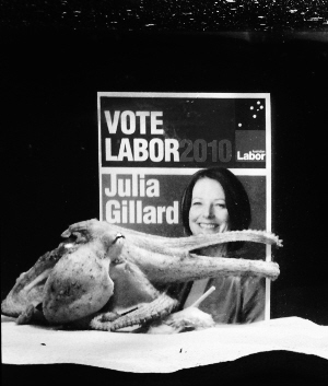 媒体则从章鱼“保罗”那里获得灵感,《悉尼先驱晨报》17日报道,它选取的章鱼“卡桑德拉”预测吉拉德将获胜。报道说,相比用触须“抱住”吉拉德的照片(右图),“卡桑德拉”看到反对派领袖阿博特的照片时身体显现“防御性黑色”
