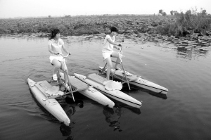 7月20日傍晚,游客在淮阳龙湖上骑着水上自行车游玩、赏荷。淮阳荷花节开幕以来,从豫、鲁、皖等周边省市县前来淮阳龙湖赏荷避暑的游客络绎不绝,龙湖迷人的自然风光让游客留连忘返。 晚报记者 杜欣 摄