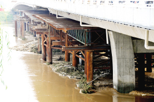 26日晚,市水务局工作人员在排查闸门泄洪情况时,发现有近130平方米树木及杂草等漂浮物堆积在沙河周口大闸第2孔至第7孔闸门之间。水务部门抢险突击队立即行动,突击队副队长、闸管站站长郭蕾第一个身绑绳索下到闸下水面杂草堆积处清理。抢险队员通过用钩子拉、用钢棍推等方法,经过近3个小时的努力,排除全部险情。