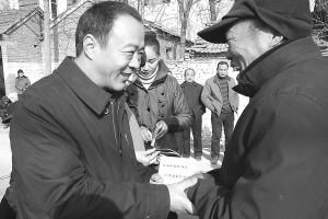 1月12日,市委书记毛超峰与领到新型农村社会养老保险金存折的扶沟老人亲切握手。扶沟县是我市唯一一个全国首批新型农村社会养老保险试点县,从12日起,该县8万多名参加新农保的60岁以上的老人,开始按月领取养老金。新型农村社会养老保险制度在扶沟的成功试点,标志着我市农村社会化养老崭新时代正在拉开大幕。