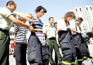 7月28日,几位市民在消防战士的协助下试穿体验重达38公斤的全套消防战斗服。
