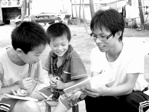 昨天上午,天津大学求是学部赴河南周口实践队6位成员来到淮阳县许湾乡,走近2009年度感动中国十大人物之一——李灵,探访她创建的希望小学,与留守儿童面对面交流,并赠送学习用品及辅导功课,跟孩子们建立了深厚的情谊。图为大学生在辅导留守娃学习。晚报记者 杜欣 实习生 姜昀辰 摄