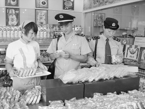 右图:9月14日下午,扶沟县工商局经检大队执法人员在扶沟县城一家超市抽查散装月饼。当天,扶沟县工商局出动30余名执法人员对该县超市、农贸市场、农村商店及食品加工点开展专项整治行动,对食品经营中存在的质量不合格、过度包装、虚假标注生产日期等有损消费者合法权益的突出问题进行了检查。据了解,中秋、国庆“双节”期间,扶沟县工商局将实行24小时值班制,及时受理处理消费者的各种投诉和纠纷,保障节日市场繁荣稳定。