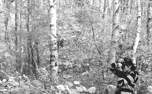 10月7日,摄影爱好者在京郊喇叭沟门国家森林公园白桦林中拍照。