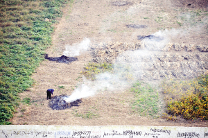17时许,记者站在东新区周口报业大厦顶楼,看见东侧一块农田里燃起几堆火,浓烟升腾,气味呛鼻。农民把秸秆拢成堆点火焚烧,大火烧过之处,留下一堆黑色的秸秆灰(如大图)。