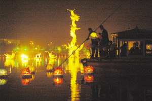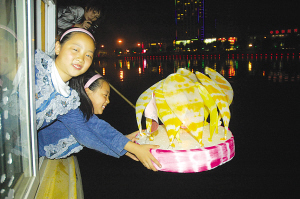 2010年10月10日,一个百年一遇、寓意“十全十美”的良辰吉日,当晚,淮阳龙湖上的盏盏玲珑秀美的荷灯随风飘动,在夜色中,营造出“天上虽无繁星点点,湖中却有荷灯绽放;天上牛郎织女,地上情侣相依”的浪漫景象(大图)。小图为当地一对双胞胎姐妹向龙湖中放送荷灯,为海南灾区人民许愿、祈福。