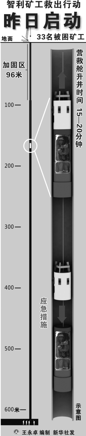 救援舱每完成一次升降井大约需要一小时,因此33名受困矿工最迟在15日全部获救。