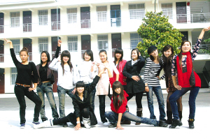 本报讯 昨天,在淮阳县委宣传部院内,赴京参加央视《欢乐英雄》节目录制的12名女学生翩翩起舞,不时摆出优美的造型,充分展现她们的自信与快乐。