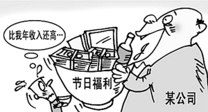 中秋节前夕,刘浩接到家里电话,得知公司给员工发放了中秋、国庆两节福利,作为双职工,小刘家领到了双份的红酒、月饼、鸡蛋等节日物资。“每逢大节日,公司都会发一些节日福利,金额也是根据职位高低不等,我这一级别每次大致能分到1000元左右的过节物资。”小刘说。