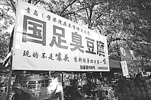 本报综合消息 在济南千佛山庙会上有一个臭豆腐摊生意特别红火,吸引众多游客慕名前来品尝,食客们除了喜欢它独特的口味之外,更青睐于它与众不同的名字——这个臭豆腐摊名叫“国足臭豆腐”(下图)。