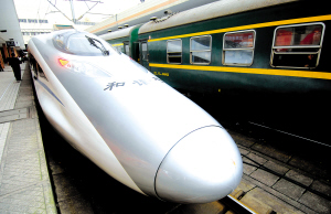 10月26日,历经18个月的紧张施工和调试,沪杭高铁正式通车。至此,我国投入运营的高速铁路营业里程已达到7431公里,居世界第一位。图为由上海始发的G5001次国产“和谐号”CRH380A新一代高速动车组列车停靠杭州火车站1号站台。右方车道停靠着一列即将发往重庆的 “绿皮车”。
