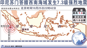 印度尼西亚苏门答腊岛10月25日发生7级以上强烈地震,政府官员26日称,地震引发海啸,已造成至少40人死亡,至少380人失踪。