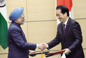 据新华社电 日本首相菅直人10月25日与到访的印度总理曼莫汉·辛格举行会谈,双方就年内正式签署经济合作协定达成共识并发表共同声明(左图)。