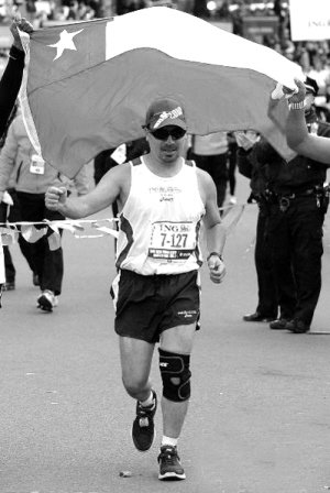 佩纳是今年8月5日智利圣何塞铜矿塌方事故中被困33名矿工之一,无论是在深井中还是在马拉松比赛现场,他都要用奔跑,诠释不向命运屈服的精神。