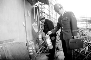 在易天国际广场,即将竣工的一栋26层高楼在滨河路八一路交叉口拔地而起。市消防支队消防监督员在检查了电焊工人的电焊证件后,又查看施工现场的消防器材和临时消防水源,发现一部分可燃物离建筑工地较近,凌乱堆放的建筑垃圾给消防通道也造成一定阻碍。得知该高层建筑有保温外墙时,消防监督员找到保温材料进行可燃检测。拿在手里的灰黄色的保温材料看起来像刚剪下的羊毛很易点燃,但打火机怎么点也点不着。据了解这些保温材料主要是由不燃型玻璃纤维制成。消防监督员告诉记者,如果高层建筑外的保温材料是属于易燃型,一旦发生火灾会像上海火灾那样加速大火的燃烧,从墙体外围引发烟雾,从而造成伤害。