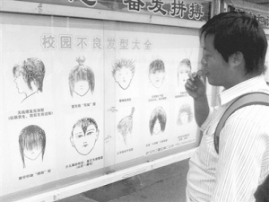 本报综合消息 不久前,武汉市民廖先生在江夏二中看到,学校宣传栏上张贴着“校园不良发型大全”(上图)。 12张手绘的男女生不良发型图整齐地排列其中,绘画手法相当幼稚,乍一看还以为是中学生涂鸦作品展览。更加“雷人”的是,学校对这些发型所起的名字,如“精神崩溃型”、“弄虚作假型”,还有“成年妇女衰老型”、“无钱理发流浪型”等。江夏二中办公室吴老师称,今年9月新学期开学时,校方设置该展板,展板上的发型图例都是从网上的一个帖子上下载的,展示目的是为了让学生严格遵守《学生守则》。(武晚)