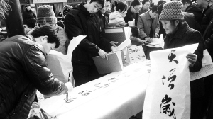 按照“文艺下乡”演出活动顺序,我市6位书法家依次登台,向现场观众展示自己的书法作品后,到舞台东侧的义写现场。当书法家依次就位后,“求”字者蜂拥而至,他们纷纷挤到桌案前,为能求到一份“墨宝”耐心等待。在人群中,一位60多岁的老人手持两张大红条幅,挤到一位书法家跟前,耐心地等待,终于得到那位书法家题写的一幅“天增岁月人增寿,春满乾坤福满门”春联。