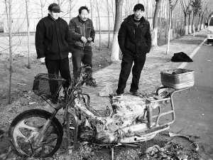 当日16时,记者接到报料赶到事发现场时,发现摩托车已被烧得面目全非,只剩下一个铁架子,车后带的被子、教材等物品全部化为灰烬(如图)。为不影响交通,宋某和几名附近村民正将摩托车铁架子拖到路旁,清理路面上散落的车辆碎片及烧焦的被子、教材。