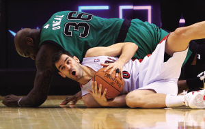 1月2日,猛龙队球员卡尔德隆(下)在比赛中与凯尔特人队球员奥尼尔拼抢倒地。当日,在2010-2011赛季NBA常规赛中,波士顿凯尔特人队客场以93比79击败多伦多猛龙队。新华社发