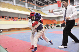 1月3日,两位小选手在太原铁路体育馆进行跆拳道比赛。当日,太原市中小学生跆拳道比赛在太原铁路体育馆举行,来自太原市中小学校的600余名小选手相聚一堂,以武会友,尽享欢乐假期。新华社发