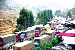 1月3日,被困车辆在210国道南丹县六寨镇路段排起长龙。1月2日晚,受因路面结冰封闭的贵新高速公路影响,8000多人滞留广西壮族自治区河池市南丹县,被困1500多辆车排成20余公里的“长龙”。新华社发
