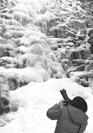 1月12日,一名摄影爱好者在黄山市拍摄六股尖冰瀑景观。近日,受强降温天气影响,安徽黄山新安江、富春江、钱塘江“三江”源头的六股尖瀑布形成罕见的大面积冰瀑,吸引众多游人和摄影爱好者前来观赏、拍照。新华社发