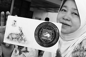 1月18日,一名马来西亚集邮爱好者在吉隆坡展示新发售的兔年生肖邮票。当天早上,马来西亚邮政局开始发售配合中国农历春节的兔票小全张,售价5林吉特。这是马来西亚邮政局自2000年推出龙年生肖邮票以来,再次推出中国农历生肖邮票。新华社发