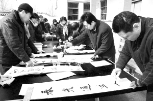 1月26日,西华县文联组织叶露生、贾冠华、高磊、宋波等10余位中国书法家协会会员,来到黄桥乡三所楼行政村,为该村群众义务书写春联。在3个多小时里,书法家们共书写春联200余幅,受到群众好评。图为写春联现场。