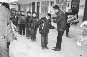 26日上午,团太康县委等单位人员为城郊乡新世纪留守儿童学校生活较为困难的部分学生送来了20件羽绒服和一些保暖护具。