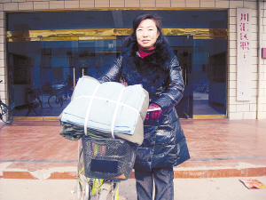 采访结束时,已经将近11时了,苏玉梅又推上了她的自行车,带上棉被(如图),要给困难户送去党和政府的温暖。