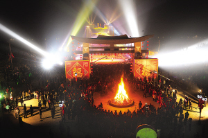 这是北川新县城开城仪式现场(2月1日摄)。2月1日,北川新县城开城仪式在新县城禹王桥广场举行。北川群众围着火堆唱响羌歌、跳起欢快的锅庄,庆祝新县城的正式对外开放和居民的入住。新华社发