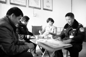 当日下午5时许,记者来到清河驿派出所,看到派出所值班室内摆放着一张小案子,正在值班的民警和王秀玲正在包饺子(如图)。值班民警告诉记者:“越是过节,我们肩上的担子就越重。为支持丈夫工作,所长齐艳军的妻子王秀玲已经连续3年在派出所过年了。”