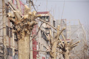 当日上午,记者在大庆南路铁路建材城附近看到,3棵直径近30厘米的法桐树冠被砍掉,崭新的断面清清楚楚,被砍的树枝就扔在不远处的绿化带旁。“太可惜了,哪有这样砍的?”市民王先生叹息道,树就要发芽长新叶了,这还咋长啊。过路市民刘女士不解地说,这树长得好好的,也不影响什么呀,怎么会被“砍头”。