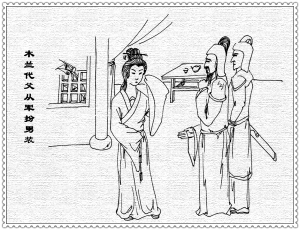 她回到家中,到自己的房里换上了女装,再出来招待她军中的伙伴时,那些伙伴都惊呆了。他们跟花木兰在一起十二年,到这时候才知道她原来是一个女子。当他们了解花木兰女扮男装、代父从军之后,对于花木兰的孝心和大智大勇更是赞佩不已。