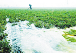 2月23日,在河南宜阳县丁沟村的一块麦田里,一位村民在用渠水浇麦。