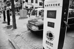 昨天上午,记者在现场看到了电动汽车充电桩的“真容”。一个约一米多高的长方体上写着“国家电网”的字样,外形犹如加油机,只是略显瘦小,绿白相间的颜色,上方是一个小显示屏和操作界面,一侧是充电接口。