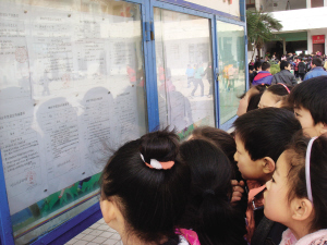 图为该校学生在宣传栏前观看19名党员教师的公开承诺书。