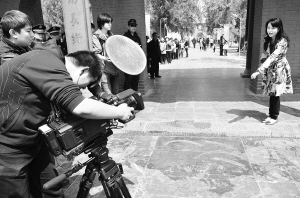 4月5日,央视《欢乐中国行》外景主持人张蕾(右一)在淮阳太昊陵景区面对镜头“说戏”。