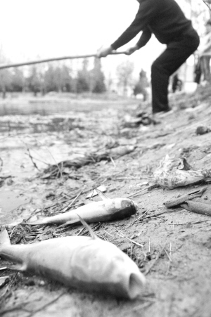 本报讯 周口人民公园落花湖是许多市民碧波荡舟的好去处。由于近日两条生活污水管道不断往湖里排放大量污水,水质被严重污染,导致昨天早上湖面突然出现大量死鱼。“这些鱼儿死了太可惜了,让人看了心疼!”当日,记者沿落花湖走了一圈,发现不少死鱼已被市民拿着网子、竹竿等工具打捞上来,堆放在岸边(如图),有的死鱼还被市民挖坑掩埋。